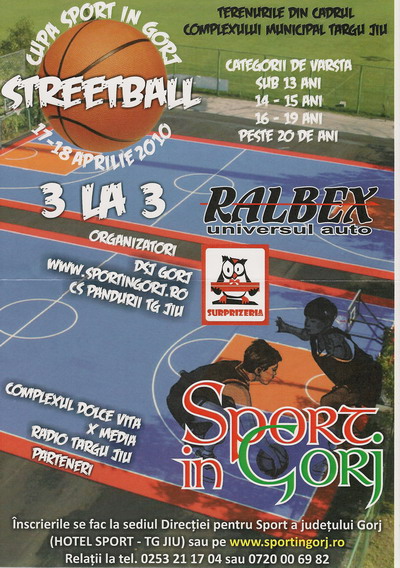 Aşa cum v-am promis, weekendul viitor va fi unul al baschetului sau, mai bine spus al streetball-ului. În funcţie de vârstă, fiecare dintre voi este aşteptat cu o echipă pentru a-şi demonstra îndemânarea şi pentru a petrece un weekend într-o atmosferă de competiţie. Baftă tuturor echipelor la prima ediţie a Cupei „Sport in Gorj” la Streetball!