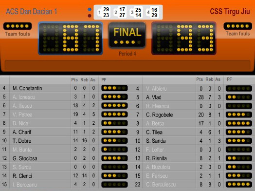 Finalul a fost unul de infarct, CSS Târgu Jiu lutând pentru egalarea care a venit după cinci minute de joc din sfertul patru, când tabela indica 80-80. Cu două minute înainte de final la conducere era CS Dan Dacian, scor 85-86. După ce au preluat conducerea cu 87-86, gorjenii s-au concentrat mai bine, Rogobete a marcat de la linia de fault de patru ori, Vlad a transformat și el două aruncări libere, în vreme ce bucureștenii n-au mai înscris decât un singur punct și CSS Târgu Jiu s-a impus cu 93-87.
